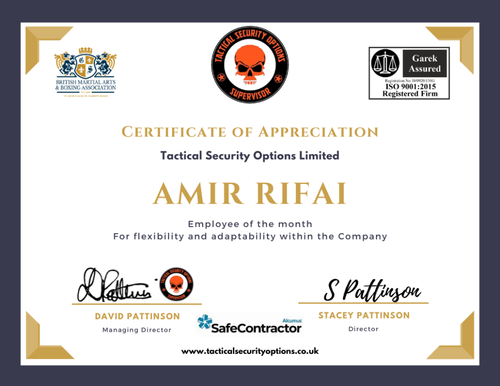 Amir Rifai, On behalf of Tactical Security Options Ltd, we would like to formally bestow you the Employee of the Month Recognition for your outstanding performance and conduct for the month of December 2025. We appreciate the outstanding effort and time you have put into your job and responsibilities. You have displayed outstanding efficiency and […]