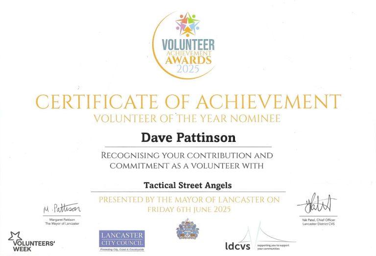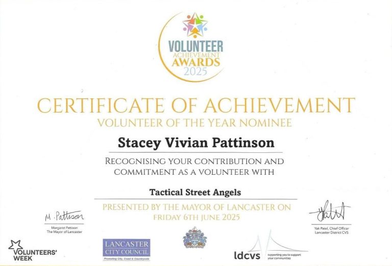 Tactical street angels charity arm of Tactical Security Options Ltd giving seven days a week. Was awarded certification of achievement, for volunteers of the street angels of lancaster. Signed off proudly by the Mayor of Lancaster and CEO of LDCVS.